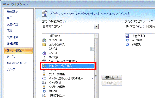 (「ハイパーリンクの挿入」を選択する場合) - 「追加」ボタンをクリックします。