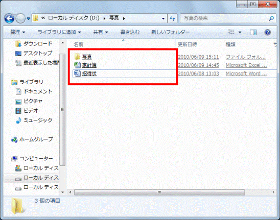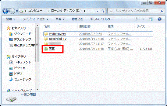 ここでは、Dドライブに展開された「写真」フォルダーが開きます。