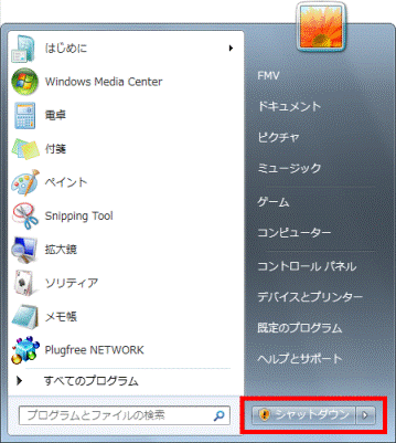 盾のマークが表示される「シャットダウン」ボタンで実行する場合