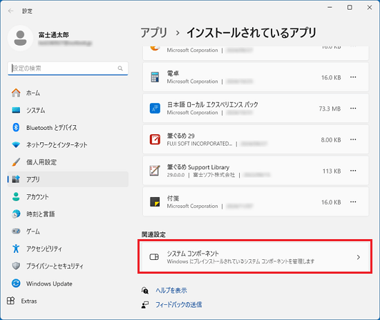 画面を一番下までスクロールし、「関連設定」にある「システムコンポーネント」をクリックして表示される一覧から探してください。