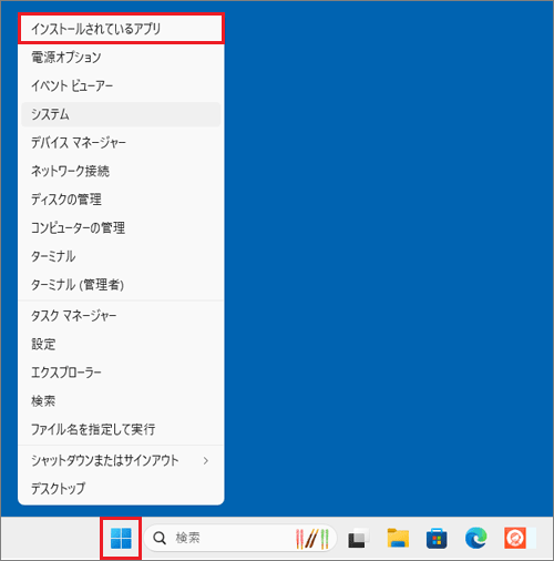 - 「スタート」ボタンを右クリックし、表示されるメニューから「インストールされているアプリ」または「アプリと機能」をクリックします。
