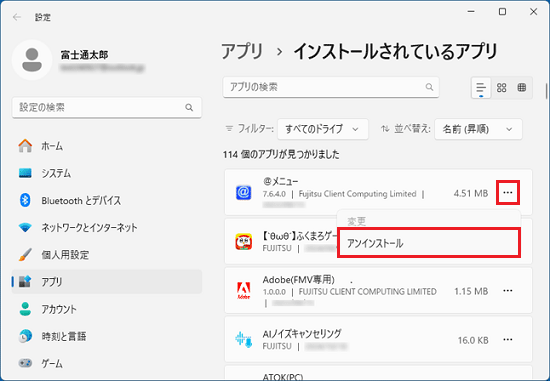 削除するアプリの「…」または「︙」をクリックし、表示される一覧から「アンインストール」をクリックします。