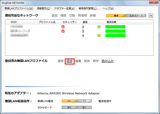 「登録済み無線LANプロファイル」の「追加」をクリックします。