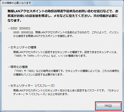 お使いの無線LANアクセスポイントのSSIDが、「登録済み無線LANプロファイル」の項目に表示されている場合は、そのSSIDをクリックしたら、「接続」をクリックして手順17.に進みます。 - 「次の情報が必要になります」が表示されます。
