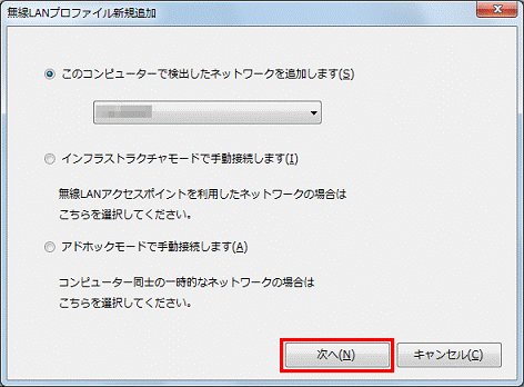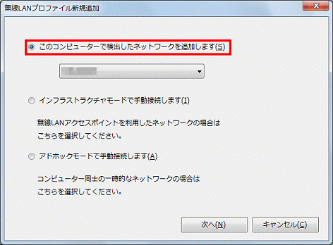 - 「このコンピュータで検出したネットワークを追加します」の「▼」ボタンをクリックし、表示される一覧から、お使いの無線LANアクセスポイントのSSIDをクリックします。