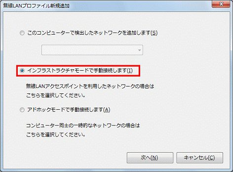 「▼」をクリックして表示される一覧に、お使いの無線LANアクセスポイントのSSIDが表示されていない場合は、「インフラストラクチャモードで手動接続します」をクリックし、手順14.に進みます。