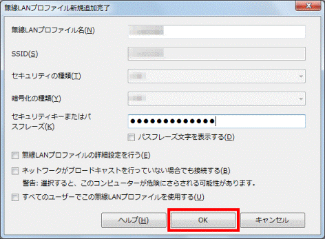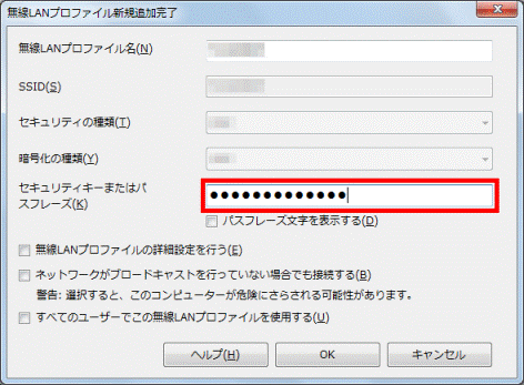 お使いの環境により、画面内の「すべてのユーザーでこの無線LANプロファイルを使用する」は表示されません。