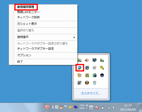 - Plugfree NETWORKのアイコンを右クリックし、表示されるメニューから「使用場所管理」をクリックします。
