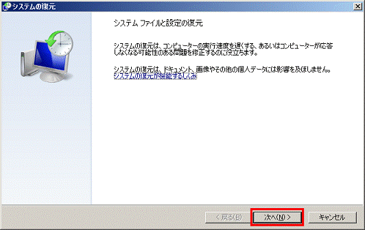システムの復元を実行する前には必ず大切なデータをバックアップしてください。 - 誤って削除してしまったデータや、何らかの原因で消去してしまったデータを復旧する目的でシステムの復元を実行しても、失われたデータは復旧されません。