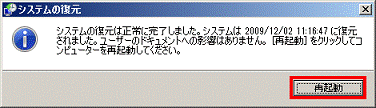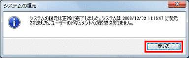 再起動後、もう一度「システムの復元は正常に完了しました。」と表示された場合は、「閉じる」ボタンをクリックして閉じます。