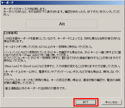 - 富士通ハードウェア診断ツールの「終了」ボタンをクリックします。