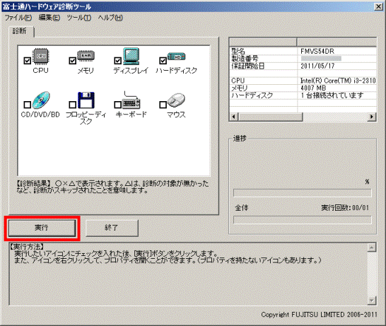 - 富士通ハードウェア診断ツールで診断する項目をクリックし、チェックを付けます。