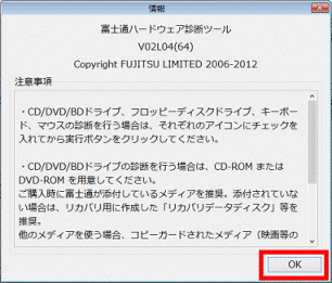 「注意事項」や、「「OK」をクリックすると、「富士通ハードウェア診断ツール」が起動します。」が表示された場合は、「OK」ボタンをクリックします。