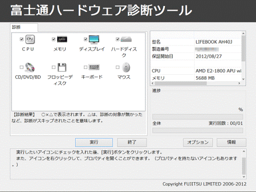 富士通ハードウェア診断ツールを使用して、お使いの機種に搭載されているCPU、メモリ、ディスプレイ、ハードディスク、CD/DVD、フロッピーディスク、キーボード、マウスに異常がないかどうかを診断できます。