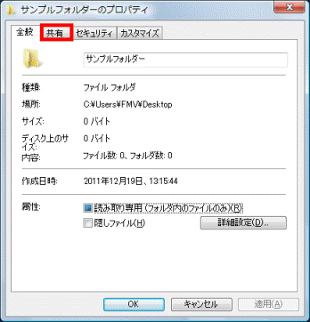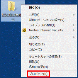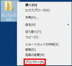 ここでは例として、デスクトップに作成した「サンプルフォルダー」にアクセス権を設定します。 - 「サンプルフォルダーのプロパティ」が表示されます。