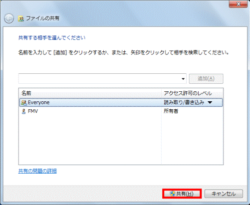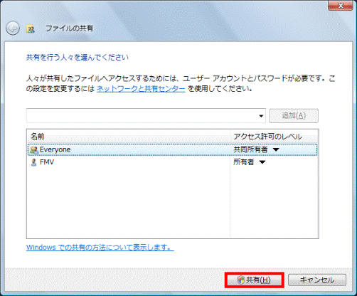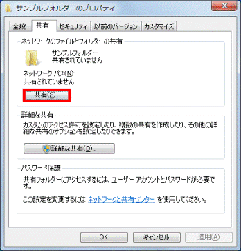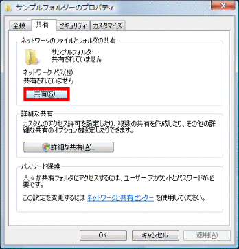 - 「ネットワークのファイルとフォルダの共有」の「共有」ボタンをクリックします。