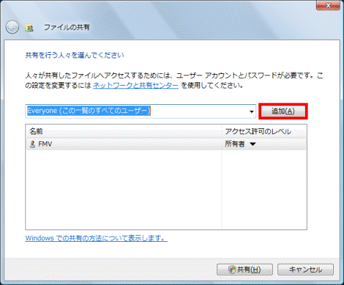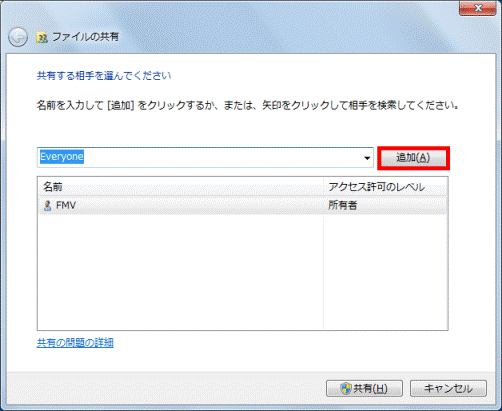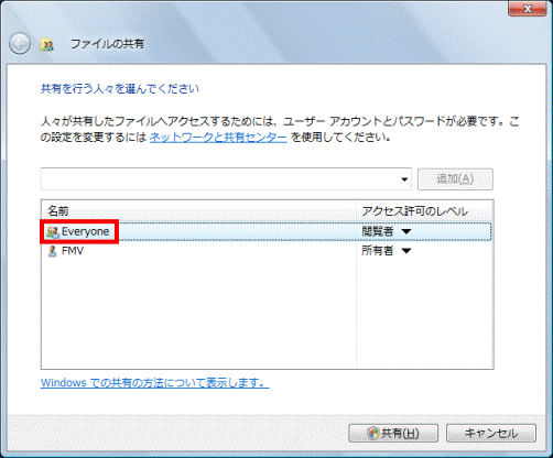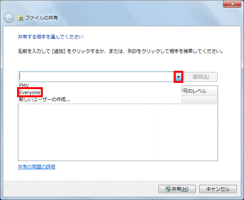 「追加」ボタンの左に表示されている「▼」ボタンをクリックし、表示されるメニューから「Everyone」をクリックします。