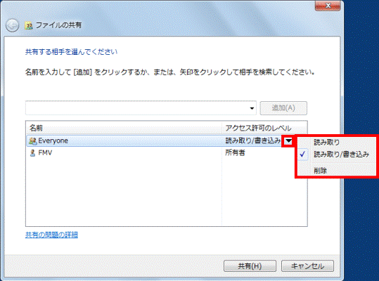 他のパソコンから、ファイルを開いたり、コピーしたりすることができます。フォルダー内にファイルを作成したり、フォルダー内のファイルを変更したりすることはできません。 - 読み取り/ 書き込み
