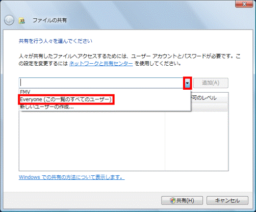 「追加」ボタンの左に表示されている「▼」ボタンをクリックし、表示されるメニューから「Everyone(この一覧のすべてのユーザー)」をクリックします。