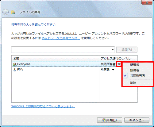 マイリカバリのディスクイメージをネットワーク接続したパソコンに保存する場合は、「共同所有者」をクリックします。 - 閲覧者