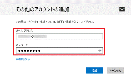 メールアドレスとパスワードの入力だけで設定が完了しない(詳細設定を入力する画面が表示される)場合は、メールサーバーの情報などを入力する必要があります。