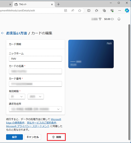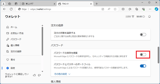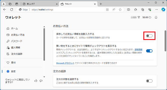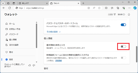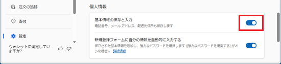 削除する情報が表示されていない場合は、「設定」をクリックし、「基本情報の保存と入力」のスイッチをクリックしてオン(青)にしてください。