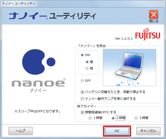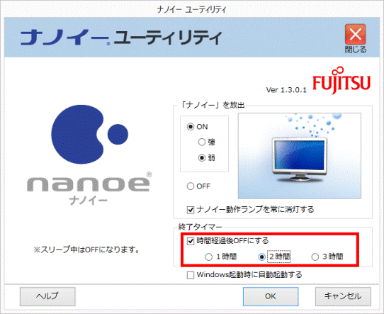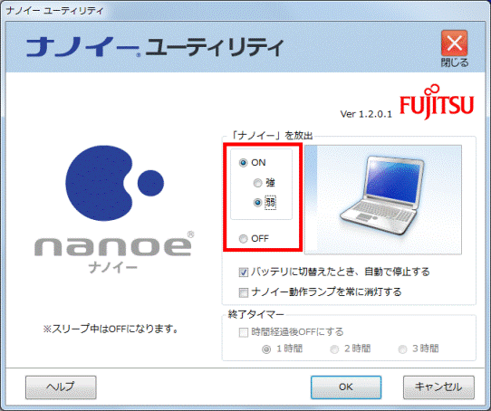 ナノイー ユーティリティで、 ナノイーの放出のON/OFFや終了タイマーを設定できます。