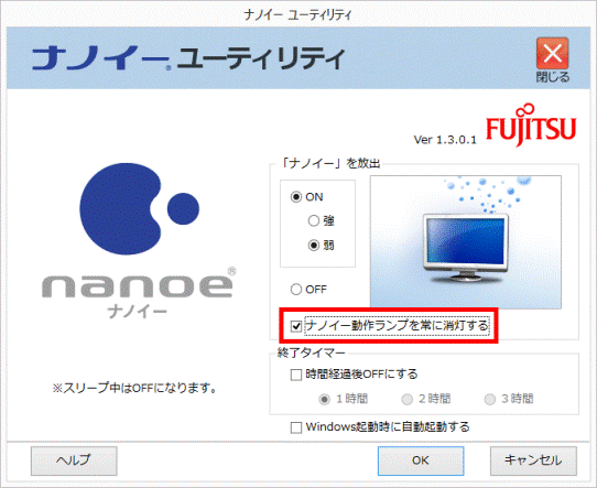 消灯するときは「ナノイー動作ランプを常に消灯する」にチェックを付け、点灯するときはチェックを外します。