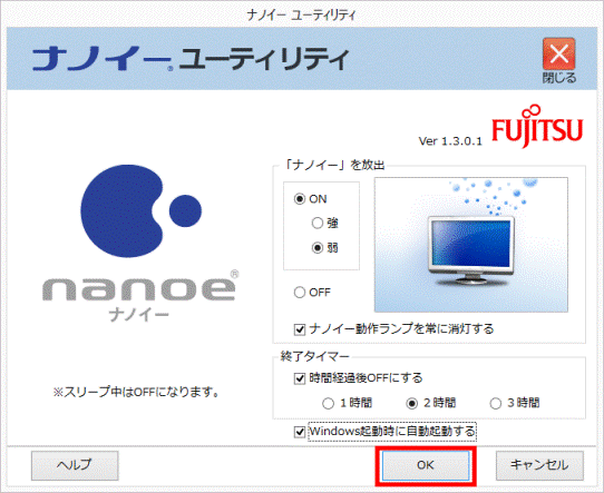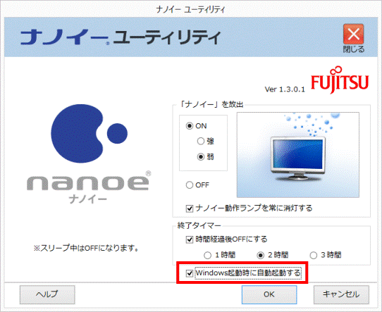- お好みで、Windowsの起動時に、ナノイーユーティリティを自動起動するかどうかを設定します。