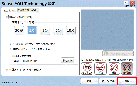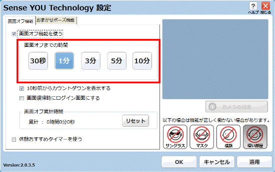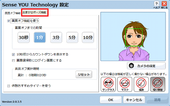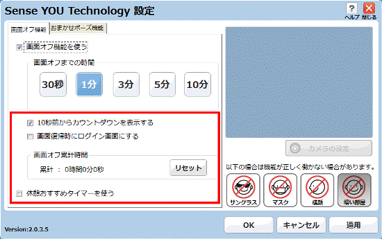 すべての機能にチェックを付けて有効にしても、画面オフ機能とおまかせポーズ機能を同時に使用できません。