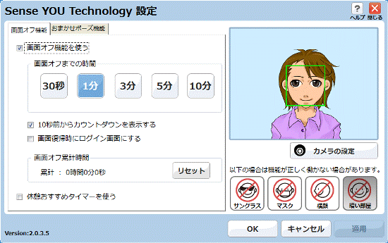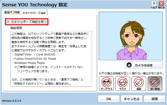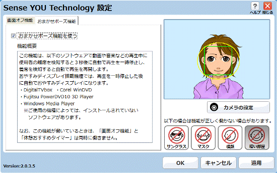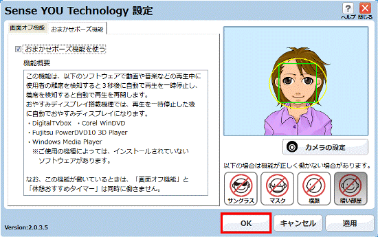 顔がうまく検出されないときは、「カメラの設定」ボタンをクリックして表示される画面で設定を変更すると、改善する場合があります。