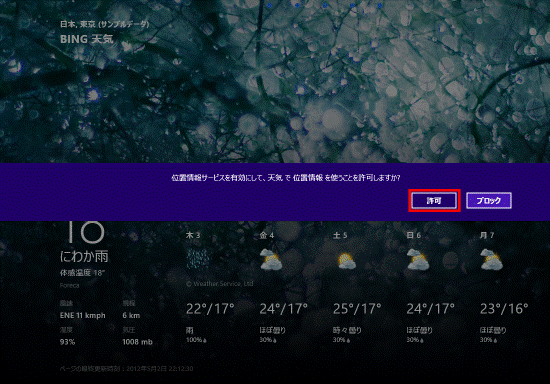 - 天気が起動します。初めて起動したときは位置情報についてのメッセージが表示されるので、「許可」ボタンをクリックまたはタップします。