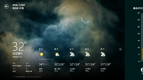 天気は、今後1週間分の天気予報や過去の天気、世界各地の天気をチェックできるアプリです。起動すると現在地、または既定に設定した場所の天気が表示されます。