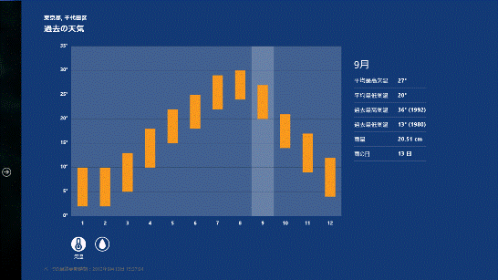 - 画面を右にスクロールすると、「過去の天気」が表示されます。月ごとに平均最高気温や雨量などを確認できます。