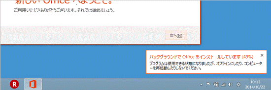アドバイス画面の右下に「バックグラウンドでOfficeをインストールしています」と表示されますが、メッセージは表示したままで問題ありません。