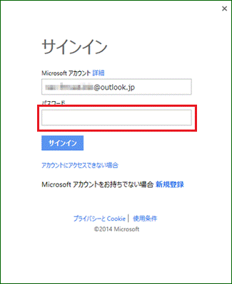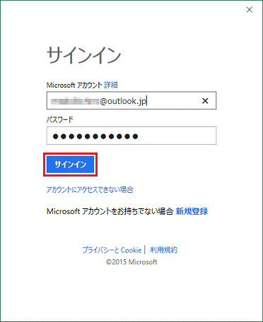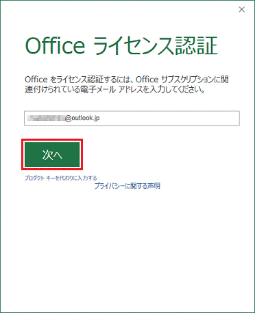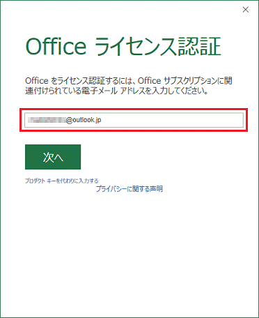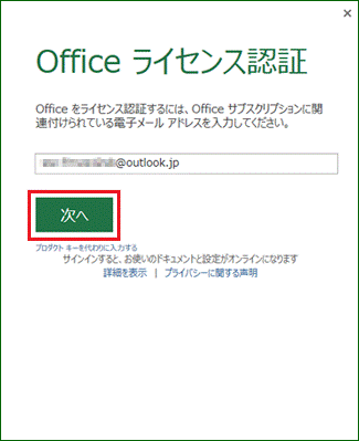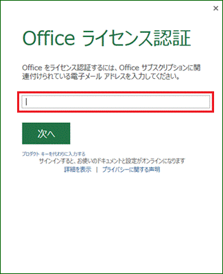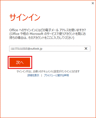 Office Premiumを初めてインストールしたときのMicrosoft アカウントを入力し、次の手順に進みます。 - 表示されない場合
