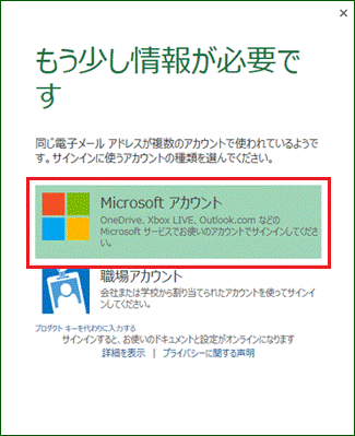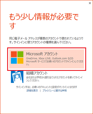 アドバイス「もう少し情報が必要です」と表示された場合は、「Microsoft アカウント」をクリックします。