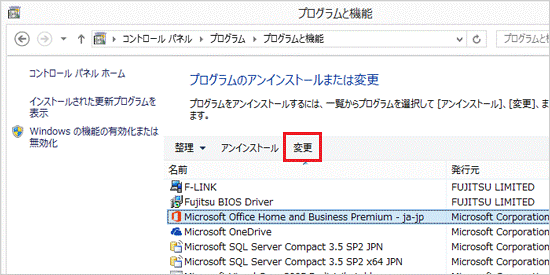 「アンインストールしてもよろしいですか?」と表示された場合は、「閉じる」ボタンをクリックしてください。 - 一覧の上部に表示される「変更」をクリックします。