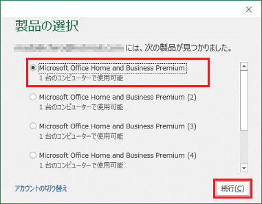 「製品の選択」と表示される場合は、「Microsoft Office Home and Business Premium」など、お使いのOffice Premium製品をクリックしてから、「続行」ボタンをクリックします。