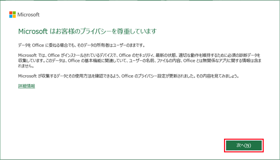 1. 「Microsoft はお客様のプライバシーを尊重しています」の内容をよく確認し、「次へ」ボタンをクリックします。