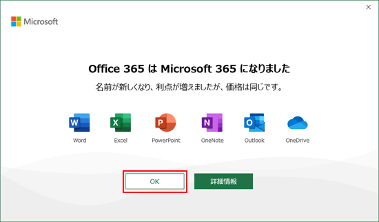 • 「Office 365 は Microsoft 365 になりました」と表示された場合は、「OK」ボタンをクリックしてください。