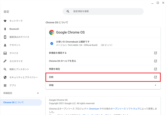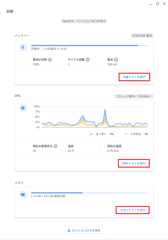 診断アプリを使うと、バッテリー、CPU、メモリなど、Chromebook のハードウェアの問題を確認できます。