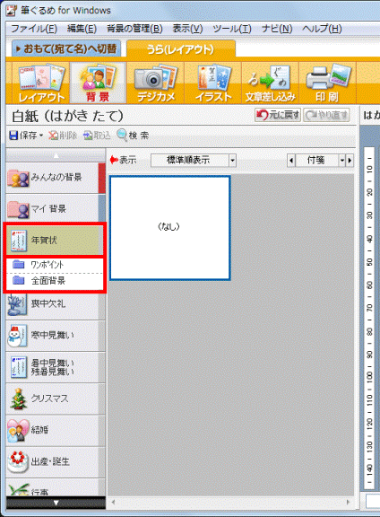次の手順で、年賀状や暑中見舞い、白紙などのレイアウトを選択します。