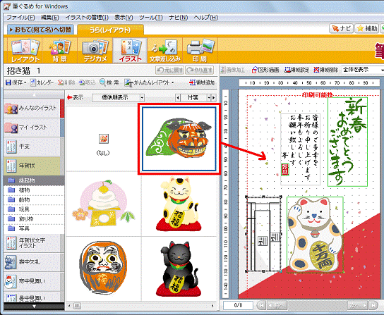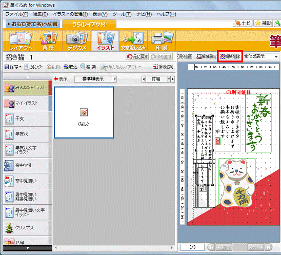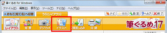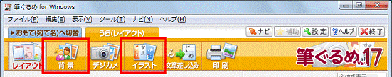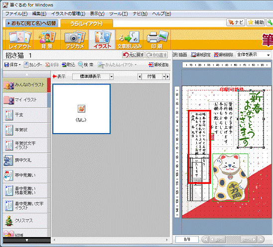 - 「うら(レイアウト)」タブの「レイアウト」ボタンや「イラスト」ボタン、「文章差し込み」ボタンなどをクリックし、イラストや文章を編集して、レイアウトを作成します。