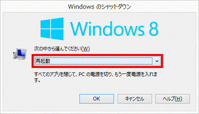 【↑】キーまたは【↓】キーを押し、「再起動」を選択します。