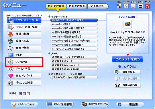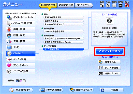 ここでは例として、CD/DVDにデータを保存するという目的でアプリケーションを探します。