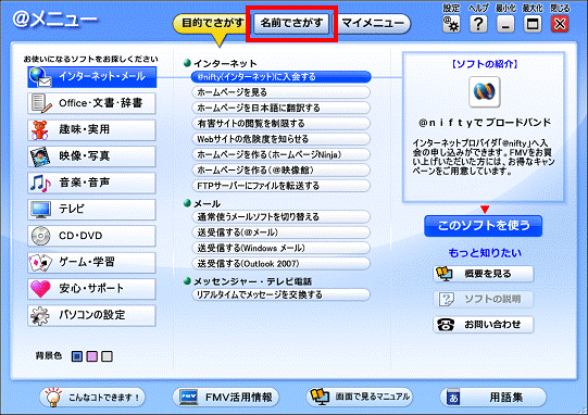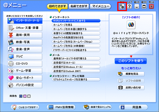 画面下部にある「画面で見るマニュアル」ボタンをクリックすると、「画面で見るマニュアル」、または「FMV画面で見るマニュアル」が起動して、電子マニュアルを閲覧できます。
