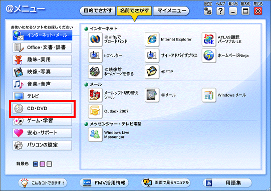 - 「スタート」ボタン→「すべてのプログラム」→「@メニュー」→「@メニュー」の順にクリックします。
