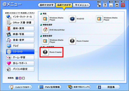 - データCDまたはDVDを作るための「Roxio Creator」(または「Roxio Creator LJ」)が表示されます。