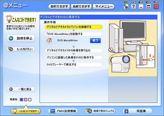 アプリケーションの使用方法について、一連の手順を「イラスト」で表示するとともに、音声で案内します。